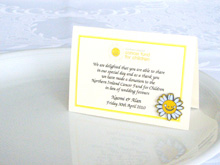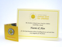 NICFC Daisy lapel pin for each guest and up to three table cards per table informing your guests of your kind donation to NICFC. Table cards are personalised, featuring the Bride & Groom's name and the date of your wedding. Suggested minimum donation of £1 per guest.